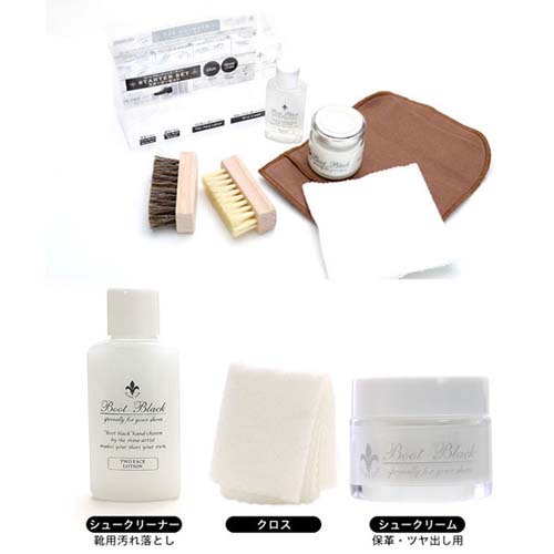| ブートブラック シルバーラインシリーズのシュークリームとクリーナーのほか、2種のブラシとクロス、グローブクロスをそろえたセット。 | |||