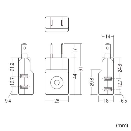 | プラグ | 2P(スイング式、絶縁キャップ付) | サイズ | 28(W)×61(D)×18(H)mm |