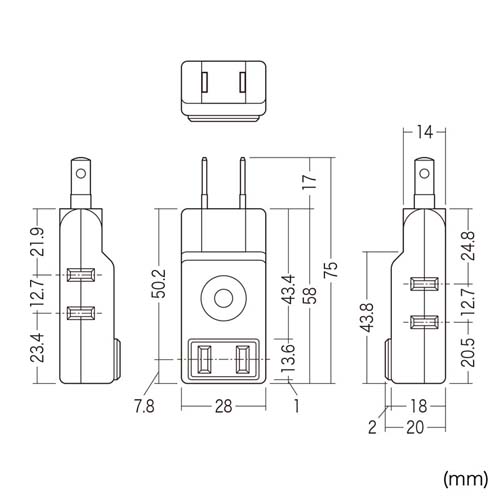 | プラグ | 2P(スイング式、絶縁キャップ付) | サイズ | 28(W)×75(D)×20(H)mm |