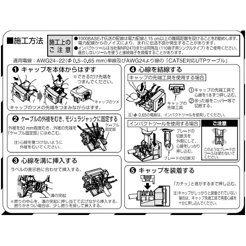 | 型 | 埋込型 | 適用電線 | φ0.5~0.65mm:単線、φ0.5mm:撚線 「CAT5E対応UTPケーブル」 |