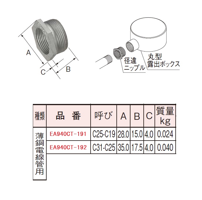 EA940CT-192 C31・C25 電線管径違ニップル(薄鋼用) |