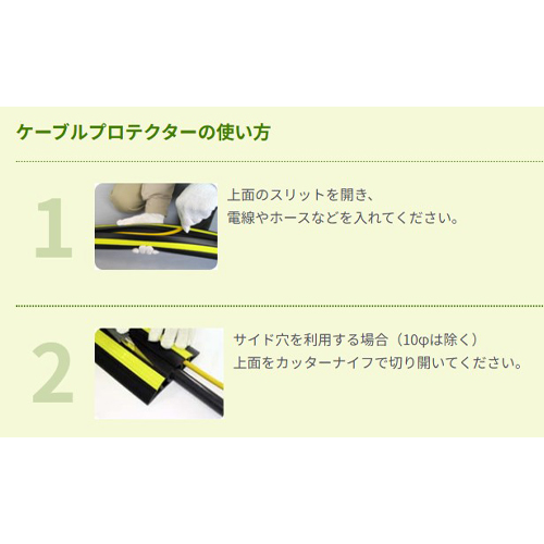 | 屋外作業現場・構内通路・イベント会場に設置することで、車輌の通行による被覆の損傷や、歩行者の引っ掛け・つまずき転倒事故を防止します。 | |||