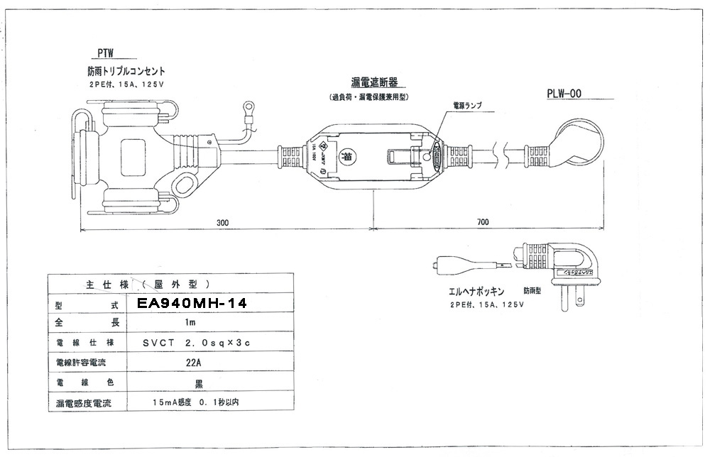 品名 : 15A/1m [防雨型]過負荷・漏電保護兼用プラグ