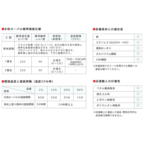 | 従来の溶剤系塗装システムと同等の防食性能を発揮し、塗装作業中や塗装後の臭いも気にならないので塗る場所を選びません。 | |||