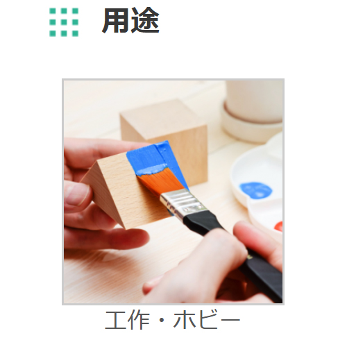 | 用途 | ・鉄・木・コンクリート・電気器具・工作品・模型等の塗装 ・油、薬品、水のかかりやすい所(エンジン付模型や水まわりの木部、植木鉢の台、機械まわり等)の塗装 |