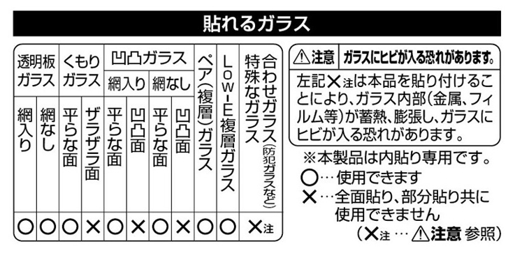 | 通常の透明ガラスだけでなく、網入りガラス、ペアガラス、Low-Eガラスにも対応しています。 | |||