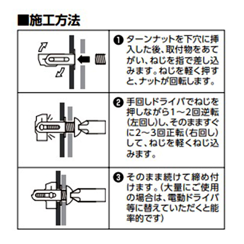 | 手が届かない所へもしっかり締結。 フランジとナットが一つになったターンナット |