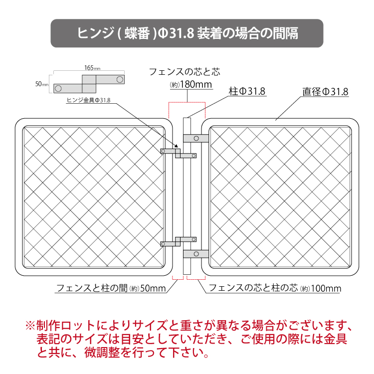 | ※フェンス同士を安定した状態で連結する場合、蝶番(ヒンジ)金具が上部・下部と2個必要になりますので、お求めの際は必要数を確認していただきご購入下さい。 | |||