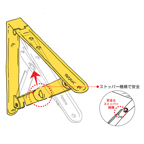 | L字型に開くだけで自動的にニュータイプのストッパー金具がセットされ、強度は抜群です。 | |||