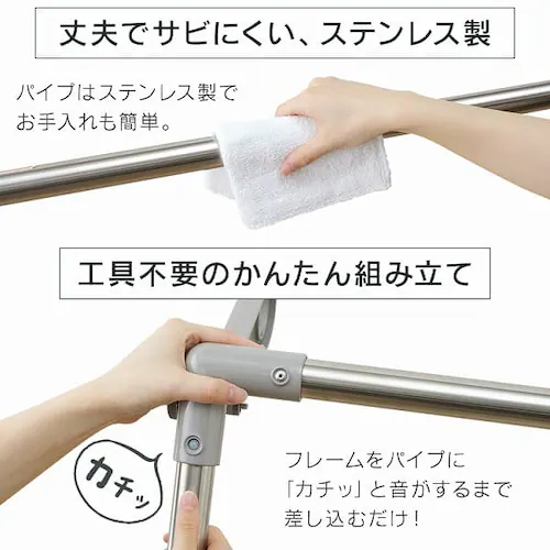 | ステンレス巻きスチールパイプを採用しているので、丈夫でサビに強く安心してお使いいただけます。 | |||
