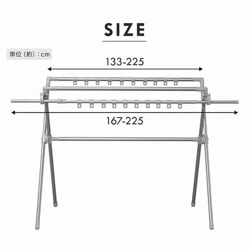 | ◆洗濯量に合わせて幅を伸縮 物干し本体と竿、それぞれに伸縮可能。 たくさん干したいときはMAXまで伸ばして、衣類やタオルもたっぷり干せる。 洗濯量が少ないときは省スペースで。 1人分の布団干しにも便利です。 |