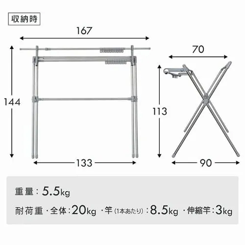 | 重量 | 約5.5kg | 耐荷重 | 全体:約20㎏、竿(1本あたり):8.5㎏、伸縮竿:3㎏ |