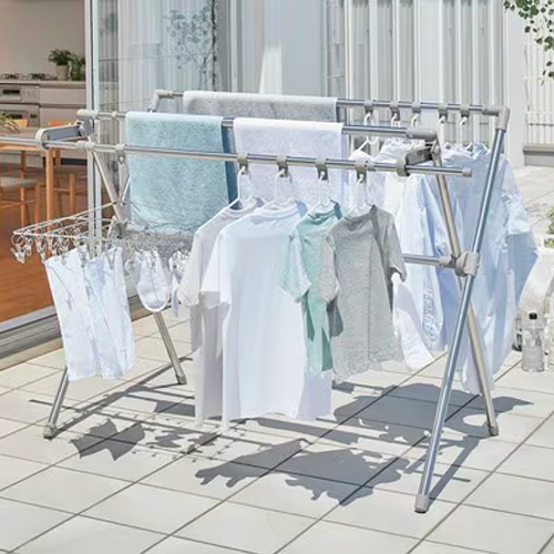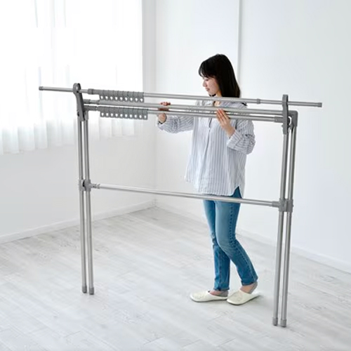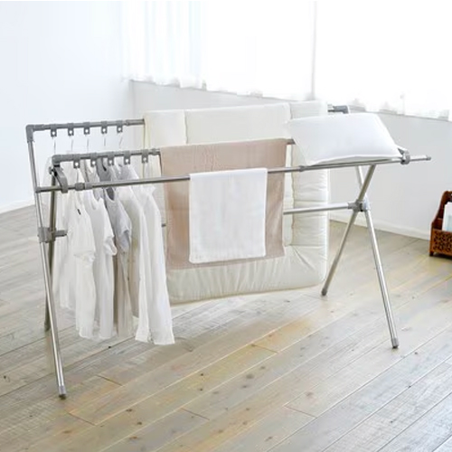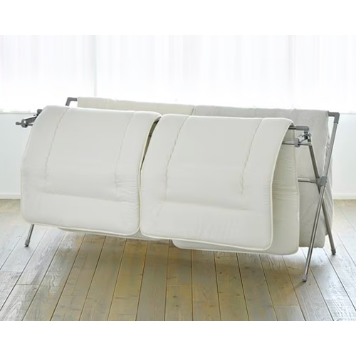 | ◆ダブルバーで布団もふっくら 空気の通り道ができるから、短時間でふっくら乾かせる! 枕やぬいぐるみをダブルバーにのせて干してもOK! ハンガーを交互に掛ければ、省スペースでもたっぷり干せる。 |