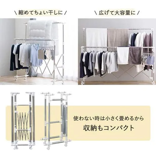 | キャスター | 自在(ストッパー付)×4 | 干せる目安 | シャツ等16枚、バズタオル4枚、タオル8枚、小物34枚 |