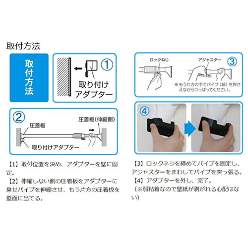 取り付け方 | 1.伸縮棒を取り付けたい位置を決め、アダプターを壁に取り付ける。 2.アダプターに伸縮棒を乗せる。 3.突っ張る。 4.アダプターを外し、完了! ※壁紙に両面テープが残っている場合は、水で濡らすと簡単に剥がれます。 |