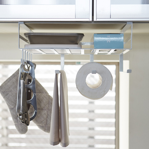 | 吊り棚の下を有効活用。 よく使う布巾、キッチンペーパー、小物等をまとめて収納できます。 |