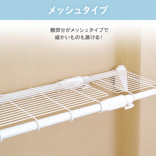 | メッシュ棚が付いているので、ポールを伸ばした際に棚部分を追加できます。 | |||
