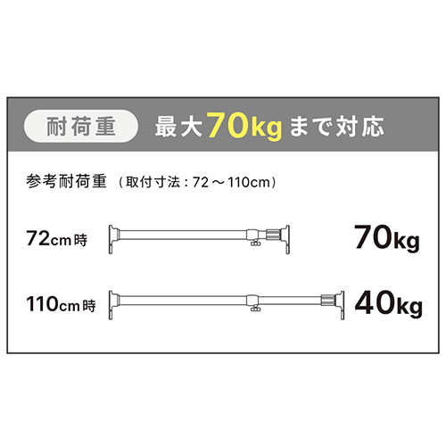 | 耐荷重 | 40~70kg | 材質 | パイプ:鉄、エポキシ樹脂粉体塗装 樹脂部品:ABS樹脂、合成ゴム 金具類:鉄、メッキ |