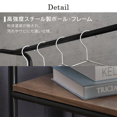 | 材質 | ハンガーパイプ:スチール(粉体塗装) パイプ:スチール(粉体塗装) 棚板:プリント紙化粧パーティクルボード |