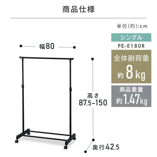 | 収納の目安 | ジャケットなどの冬物:11着 シャツ・ブラウスなどの夏物:14着 |