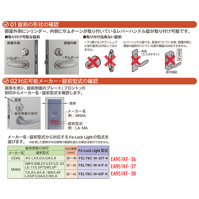 | 取付可能な錠前の型式・扉形状・扉厚などをご確認ください。 | |||