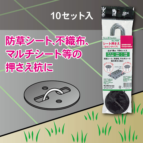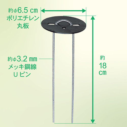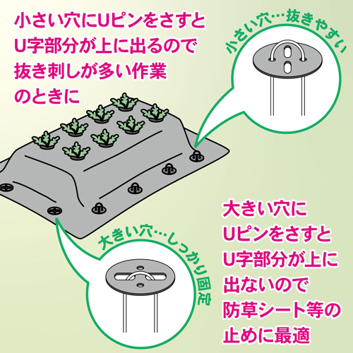 大きい穴にUピンをさすとU字部分が上に出ないので防草シート等の止めに最適 | |||