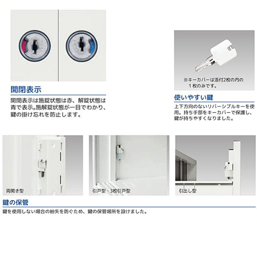 | ・開閉表示 施錠時が赤、開錠時は青で表示されます。施解錠状態が一目でわかり鍵のかけ忘れを防止。 |