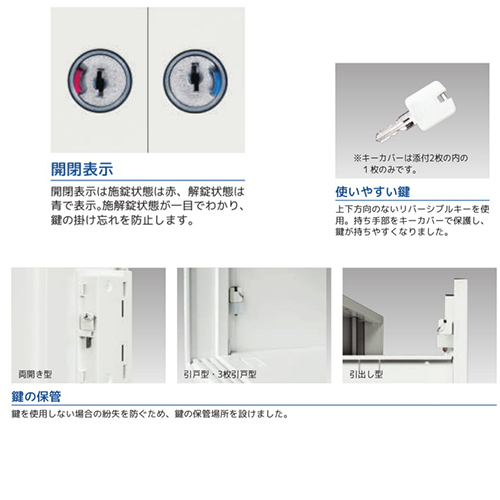 ・開閉表示 施錠時が赤、開錠時は青で表示されます。施解錠状態が一目でわかり鍵のかけ忘れを防止。 |