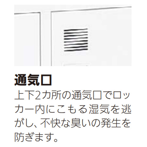 | 上下2ヵ所の通気口でロッカー内にこもる湿気を逃がし、不快な臭いの発生を防ぎます。 | |||