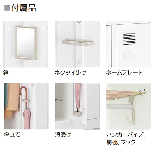 | 付属品 | ハンガーパイプ、鏡、網棚×2 一扉あたり:フック、ネクタイ掛け、傘立て、滴受け、ネームプレート |