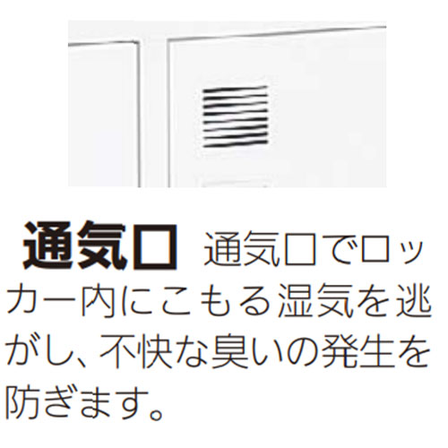 | 上の通気口でロッカー内にこもる湿気を逃がし、不快な臭いの発生を防ぎます。 | |||