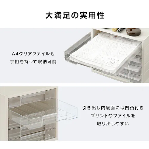 ◆大満足の大満足の実用性 A4クリアファイルも余裕を持って収納可能。 引き出し内底面には凹凸付き。 →プリントやファイルを取り出しやすい! |