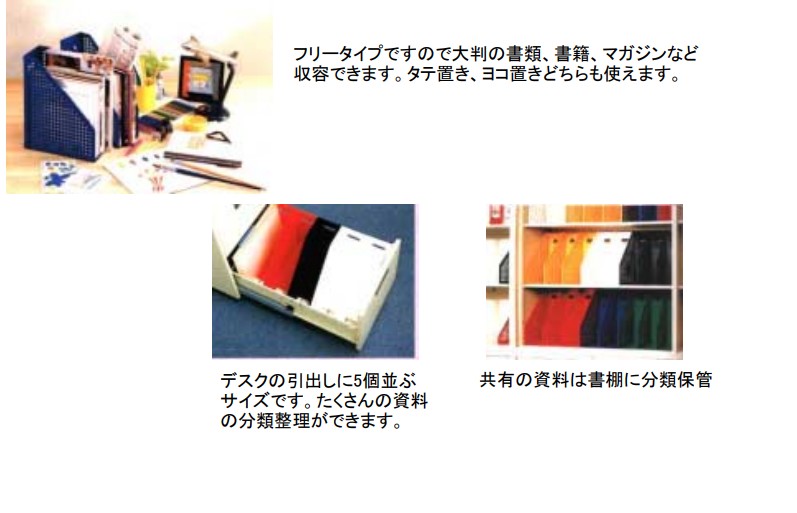 | フリータイプですので、大判の書類、書籍、マガジンなどを収容できます。タテ置き、ヨコ置きのどちらでも使用できます。 | |||