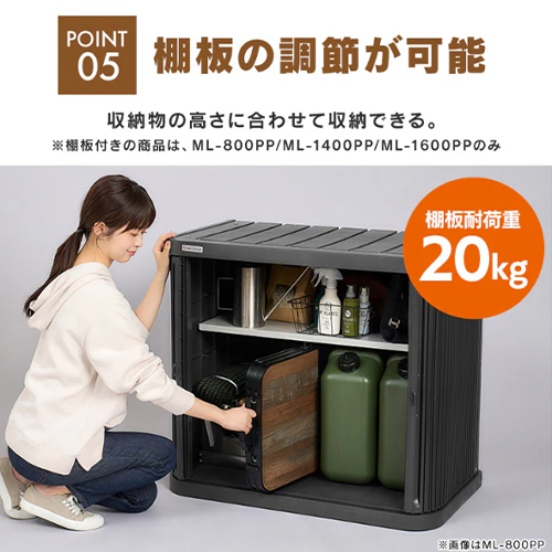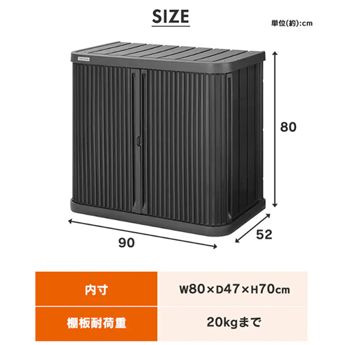 | 耐荷重 | 天板100kg、可動棚板20kg | 材質 | 本体:ポリプロピレン シャッター:ポリプロピレン、熱可塑性エラストマー 補強パイプ:金属(鋼)(塩化ビニル) 棚板:金属(鋼)(エポキシ樹脂塗装) |