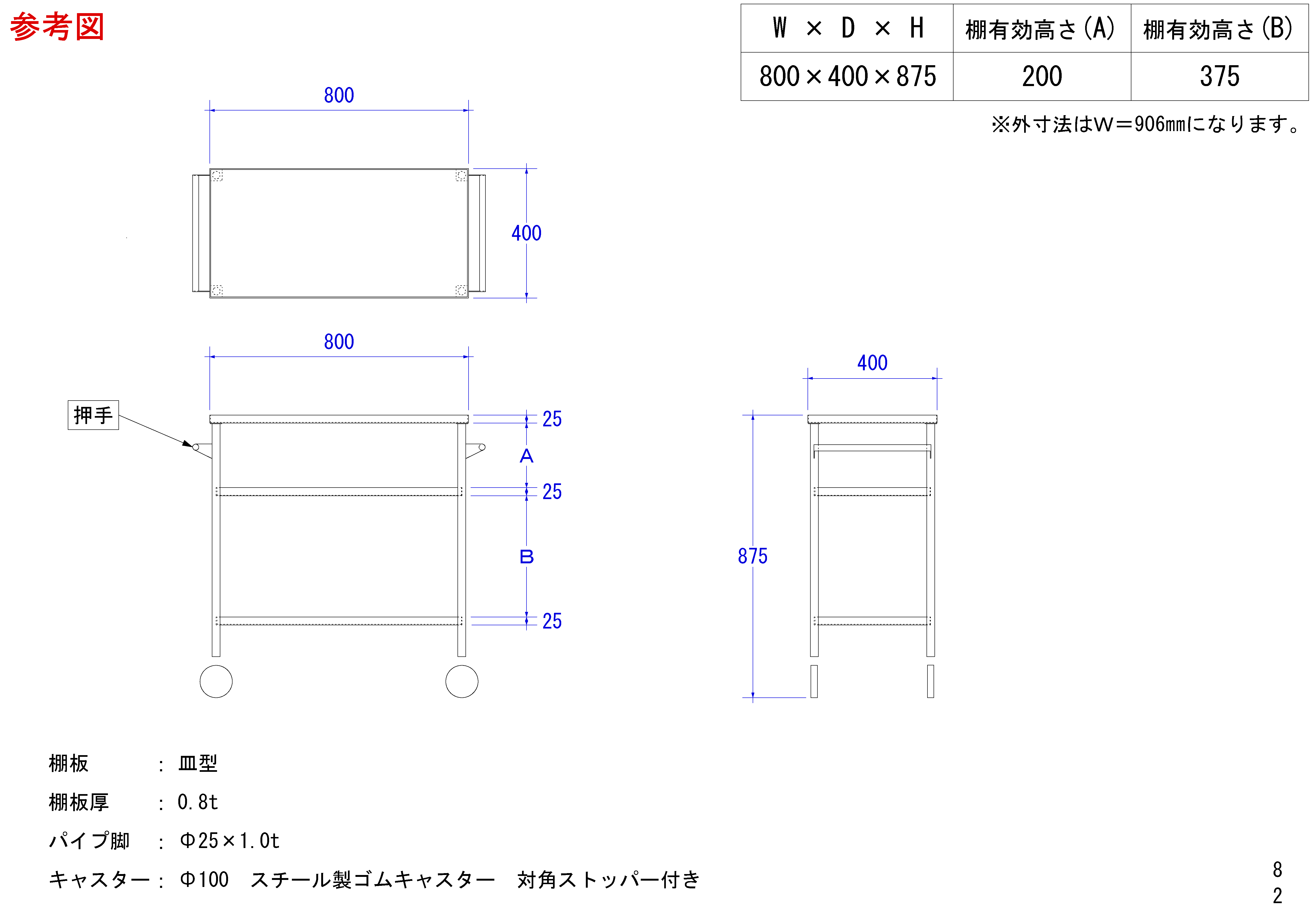 | キャスター | φ100mmゴム車 | 耐荷重 | 90kg(30kg/段) |