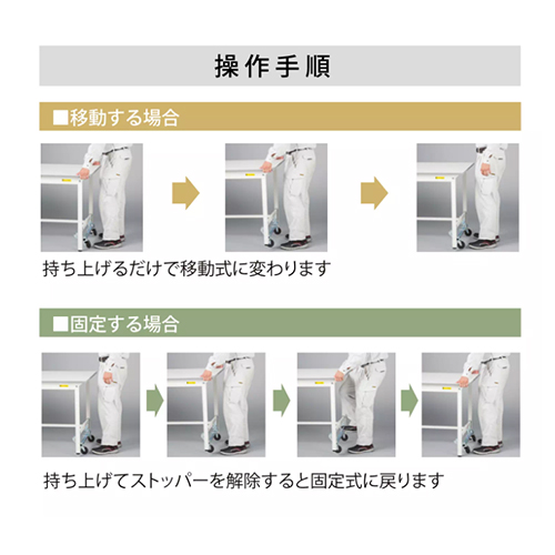 移動する場合は一旦持ち上げるだけで移動式に、 固定する場合は持ち上げてストッパーを解除することで固定式になります。 |