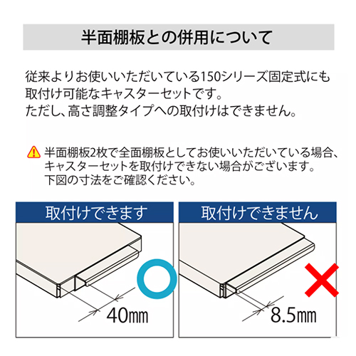 ※半面棚板を2枚ご使用の上全面棚板付としてお使いいただいている場合、キャスターセットを取付けできない場合がございます。 | |||