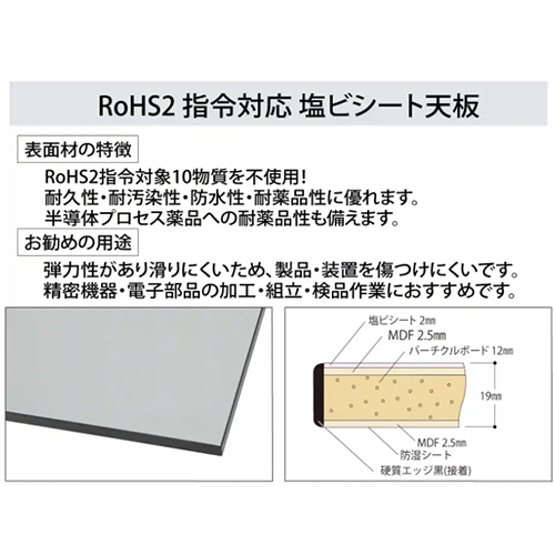 RoHS2指令対応の塩ビシートを使用した天板仕様。 耐久性・耐汚染性・防水性・耐薬品性に優れています。弾力性があり滑りにくいため、製品・装置を傷つけにくいです。表面色は目に優しいライトグレー色。 |