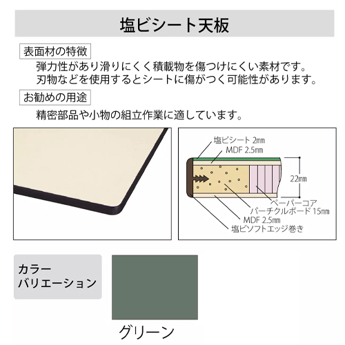 塩ビシート天板仕様。耐久性・耐汚染性・防水性に優れ、弾力性があり滑りにくいです。 | |||