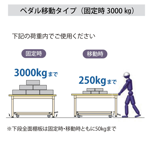 | 天板厚 | 37mm | 耐荷重 | 固定時:3000kg(均等荷重) 移動時:250kg(積載可能重量、自重含む) |