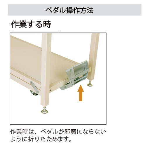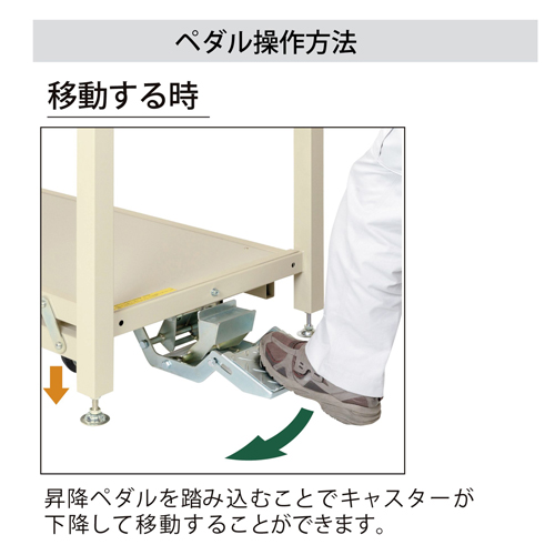 | 昇降ペダルを踏み込むことでキャスターが下降して移動することができ、 ストッパー解除ペダルを踏みながら昇降ペダルを戻すと、脚が床について固定されます。 |