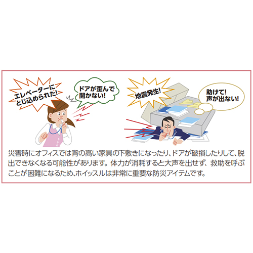 | 軽く吹くだけで音が出るので、声が出せなくても助けを呼ぶことができます。 | |||