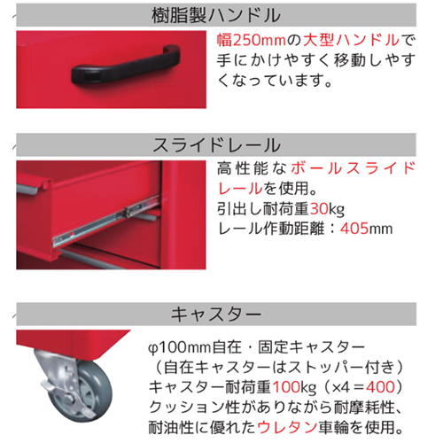 | キャスター耐荷重 | 100Kg(×4=400) | 材質 | 本体・引出し:SPCC 取手:ABS キャスター:ウレタン 錠前:ZDC2 |