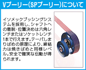 | <一般用Vプーリーが使用できます> 一般用Vベルト(B・BX)、細幅Vベルト(5V・5VX)、SPベルト(SPB)が使用可能! |
