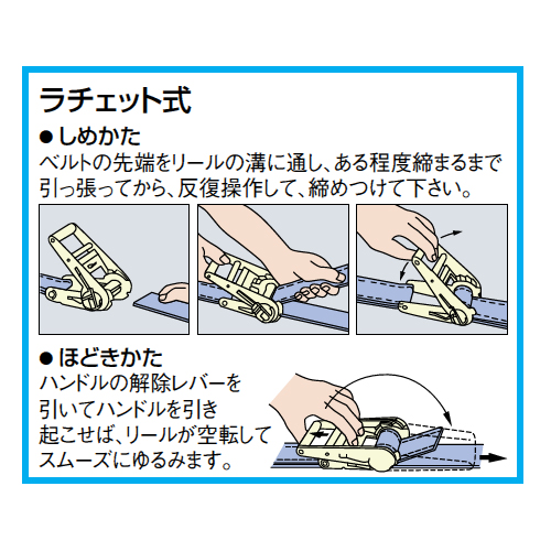 | 荷物の締め付け作業を容易にしたベルト荷締め機は、トラック輸送をはじめとする陸・海運業界やFA分野、そしてパレット搬送などに広くご利用いただいております。 | |||
