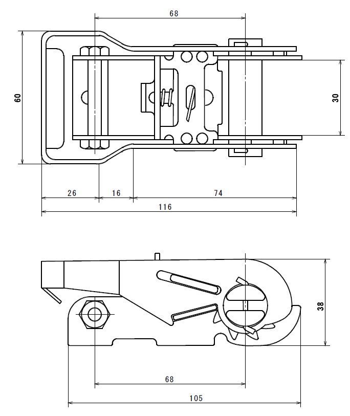 | ラチェットバックルは、固定したい荷物に装着し、ラチェットレバーを反復運動させることで強く締付けることができます。 | |||