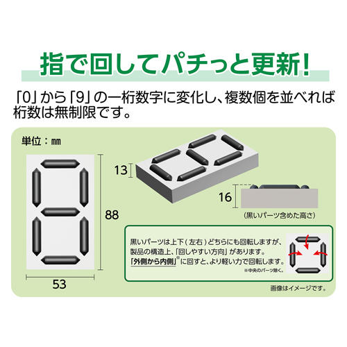 | 指一本でパーツを半回転させるだけで簡単に数字を更新できます。 | |||