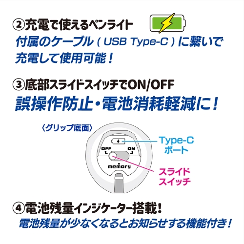 底部スライドスイッチ採用で誤操作防止、電池消耗軽減します。 | |||