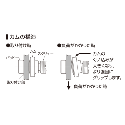 | スクリューとカム、パッドにより、作業中の振動等に対してもクランプは外れにくい機構 | |||
