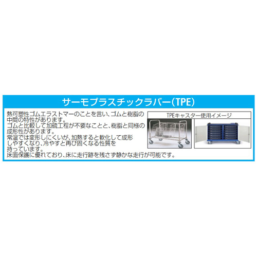 | 材質 | 金具:スチール(プレス鋼板、亜鉛メッキ三価クロメート仕上げ) 車輪:サーモプラスチックラバー (TPE) リム:ポリプロピレン |